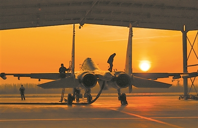 图②:迎着朝阳,机务人员完成起飞前的保障工作。