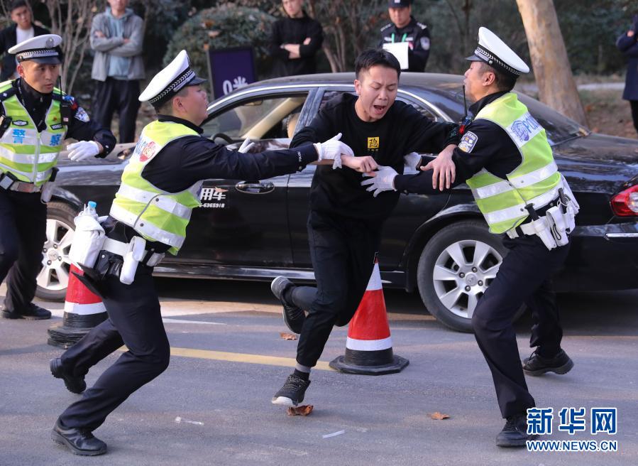 11月12日,选手在交通违法现场查处和阻碍执行职务应对处置竞赛中比武。新华社记者 殷刚 摄