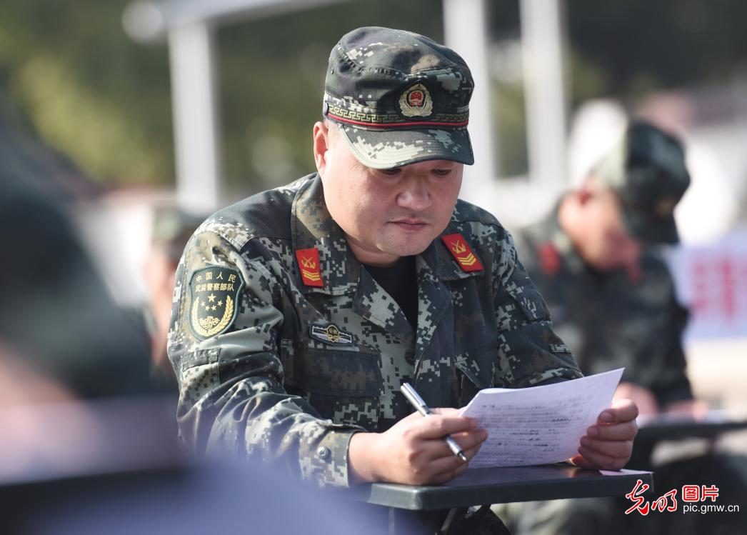 2020年11月9日,安徽合肥,在武警安徽总队训练基地,一名满服役期三级警士长在进行理论考核。11月9日至10日,武警安徽总队组织360余名中(高)级士官选晋对象进行考核,最大限度留住各类备战打仗人才。(徐伟摄/光明图片)