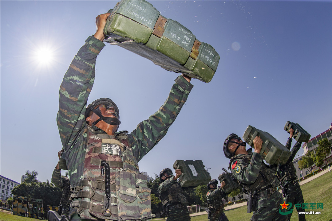 特战队员在进行推举弹箱训练。余海洋 摄