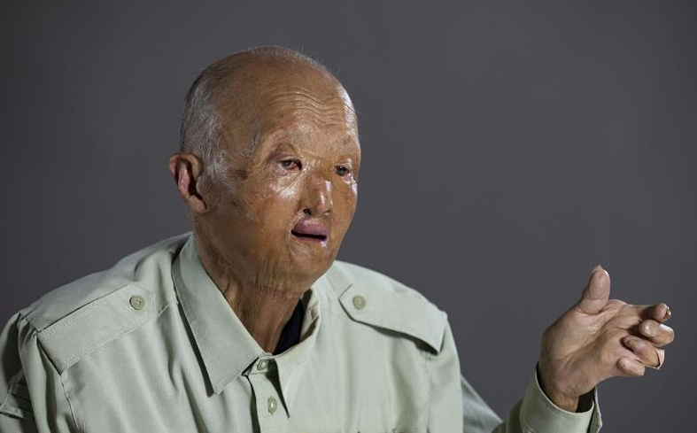 在四川省成都市,志愿军老战士涂伯毅讲述战争往事(9月28日摄)。 涂伯毅,1931年生,重庆云阳人,1950年随部队入朝。涂伯毅经历了抗美援朝战争第一、二、三、四次战役,1951年2月,遭敌人凝固汽油弹袭击,全身大面积烧伤,致一级伤残。