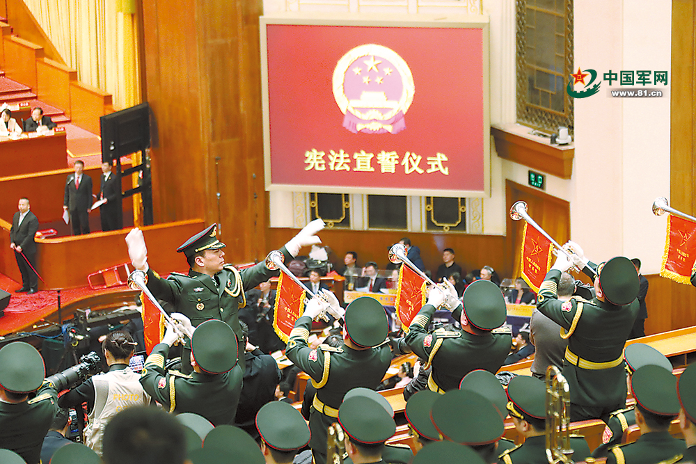 3月18日上午,十三届全国人大一次会议举行第六次全体会议。图为中国人民解放军军乐团奏响宣誓仪式曲。