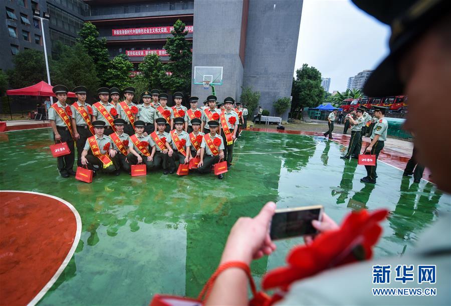 9月13日,深圳消防部队退伍士兵与留队战友合影。