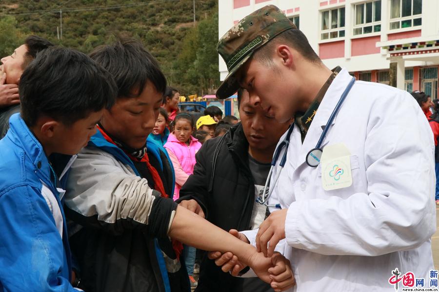 10月13日,在江达县同普乡安置点,武警西藏总队昌都支队医疗小分队正在对从波罗一小和冲桑小学安全转移过来的师生进行义务巡诊。韩瑞 摄