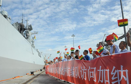 6月4日,在加纳特马港,中方人员迎接中国海军第二十八批护航编队军舰。由导弹护卫舰盐城舰、潍坊舰和综合补给舰太湖舰组成的中国海军第二十八批护航编队4日抵达特马港,开始对加纳进行为期4天的友好访问。