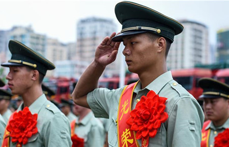 9月13日,深圳市公安消防支队举行2018年度夏秋季士兵退伍仪式,此次退伍士兵共59人,为2013年及2016年入伍的上等兵和下士。