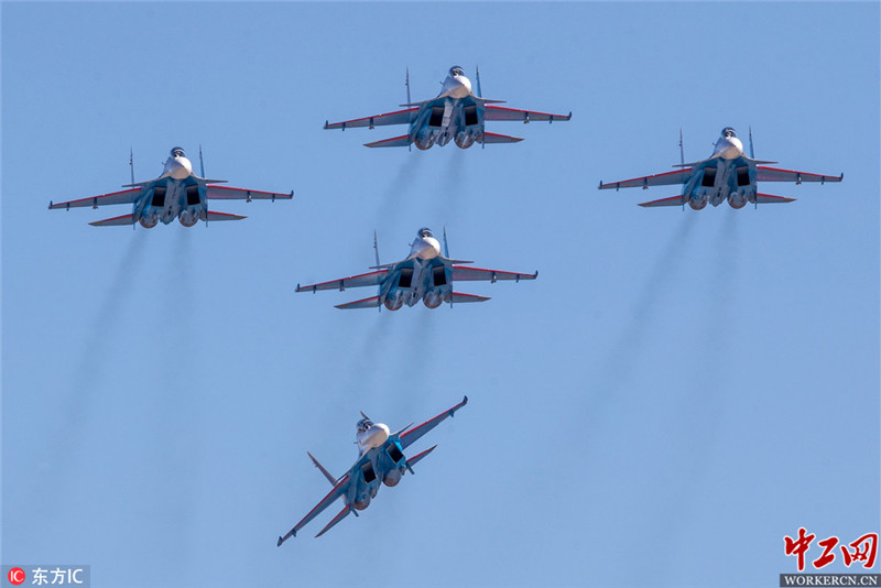 当地时间2018年4月9日,俄罗斯莫斯科,俄罗斯举行胜利日阅兵飞行表演的彩排,纪念卫国战争胜利73周年。