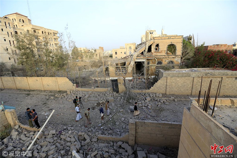 当地时间2018年6月6日,也门萨那,遭空袭倒塌的建筑。6月5日,也门首都萨那遭遇沙特联军发动的空袭。据媒体报道,共有至少9人包括2名妇女在本次空袭中受伤。