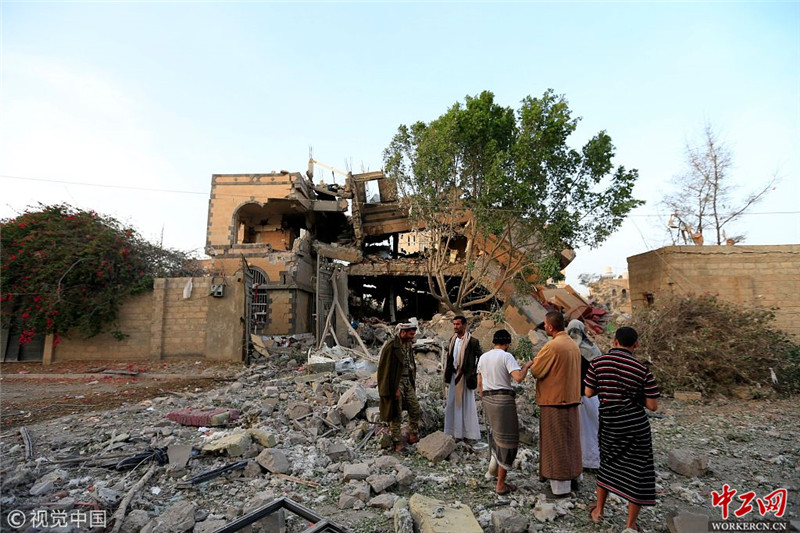 当地时间2018年6月6日,也门萨那,遭空袭倒塌的建筑。6月5日,也门首都萨那遭遇沙特联军发动的空袭。据媒体报道,共有至少9人包括2名妇女在本次空袭中受伤。