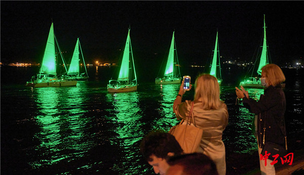 葡萄牙:帆船队亮灯在夜间航行 梦幻无比