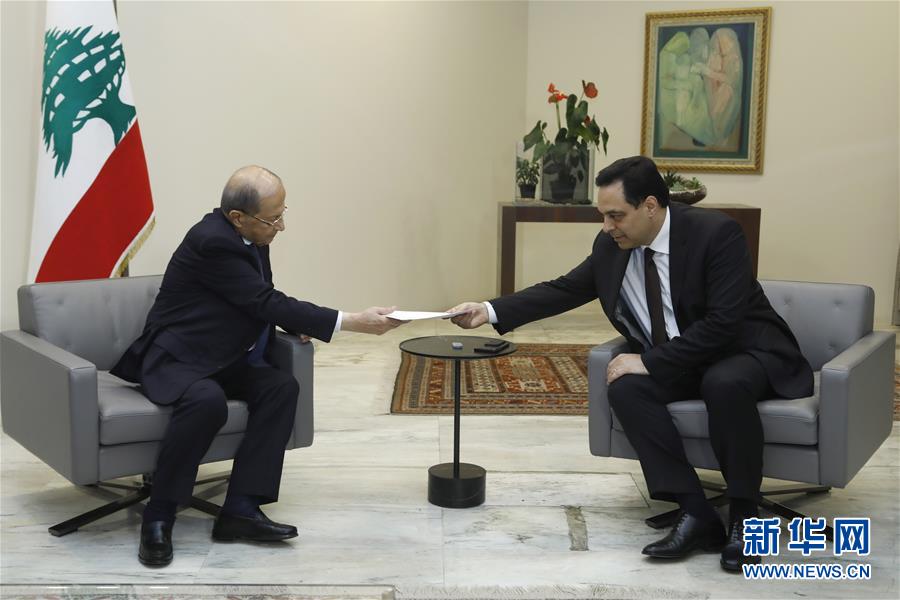 8月10日,在黎巴嫩首都贝鲁特东南的总统府,黎巴嫩总理哈桑·迪亚卜(右)向黎巴嫩总统米歇尔·奥恩递交辞呈。 新华社发(黎巴嫩官方摄影机构达拉提和努赫拉供图)