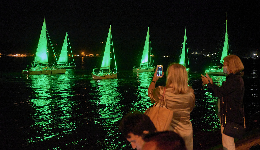 葡萄牙:帆船队亮灯在夜间航行 梦幻无比