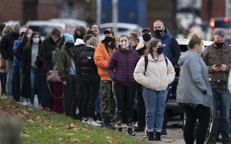 11月8日,在加拿大多伦多,人们在一处新冠病毒检测中心外等候检测。 截至当日下午,加拿大累计新冠确诊病例上升至264045例,累计死亡病例10522例。