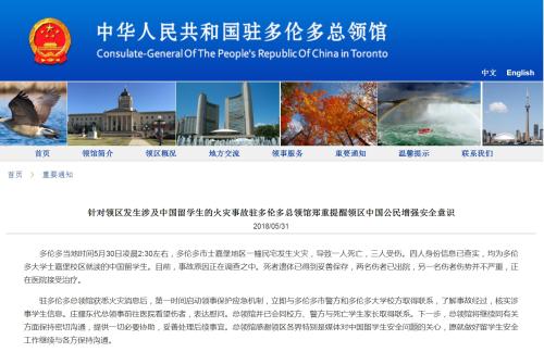 中新网5月31日电 据中国驻多伦多总领馆网站消息,当地时间5月30日凌晨2时30分左右,多伦多市嘉堡地区一幢民宅发生火灾,导致中国留学生一人死亡,三人受伤。领馆已于第一时间启动领事保护应急机制,并提醒领区中国公民增强安全意识。