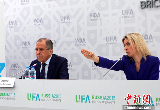资料图:俄罗斯外长拉夫罗夫(左)在乌法举行的新闻发布会。中新社发 王修君 摄