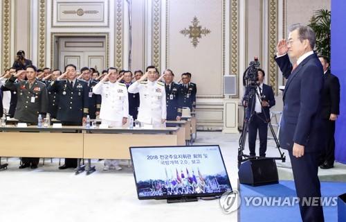 资料图片:7月27日,在青瓦台,文在寅(右)出席全军主要指挥官会议。(图片来源:韩联社)