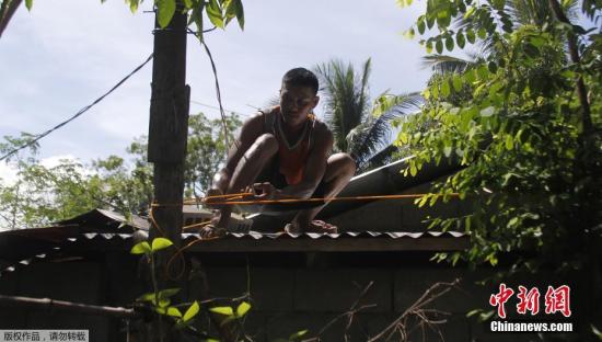当地时间9月13日,菲律宾伊洛科斯省居民加固房屋,为抵御超强台风“山竹”做准备。