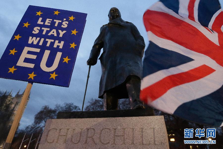 1月15日,在英国伦敦,民众在议会大厦外的英国前首相丘吉尔雕像前参加集会。 英国议会下院15日投票否决了此前英国政府与欧盟达成的“脱欧”协议。在经过5天辩论后,英国议会下院15日以432票反对、202票支持的投票结果否决了“脱欧”协议。 新华社发(蒂姆·爱尔兰摄)