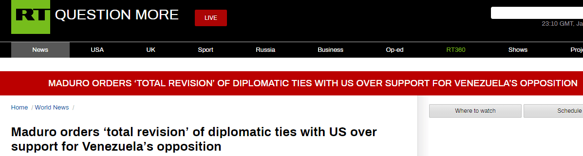 RT称,由于美国支持委内瑞拉反对派,马杜罗下令“全面修改”与美国的外交关系。