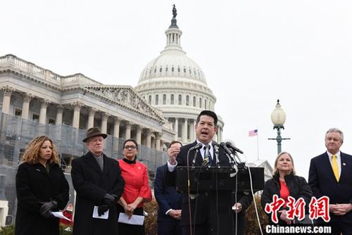 资料图:当地时间1月17日,TJ·考克斯(图中讲话者)等多位民主党众议员在国会山举行联合记者会,呼吁美国总统特朗普尽快结束政府停摆。中新社记者 陈孟统 摄