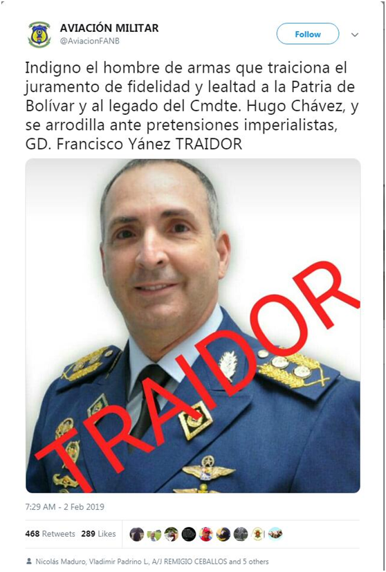 委内瑞拉空军在社交媒体上发文谴责亚涅斯为“叛徒”
