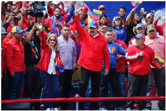 马杜罗夫妇2日在加拉加斯的集会上向支持者示意