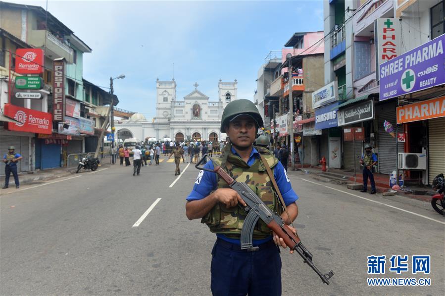 4月21日,在斯里兰卡科伦坡,一名士兵在发生爆炸的圣安东尼教堂外警戒。 新华社发(哈普拉彻奇摄)