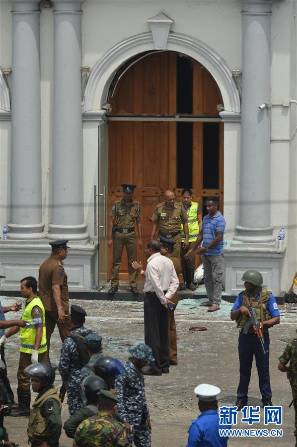 4月21日,在斯里兰卡科伦坡,安全人员聚集在发生爆炸的圣安东尼教堂外。 新华社发(哈普拉彻奇摄)