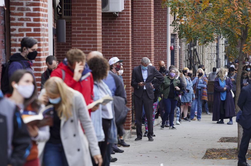 10月28日,在美国华盛顿的一处投票站,选民排队参加投票。新华社记者 刘杰 摄