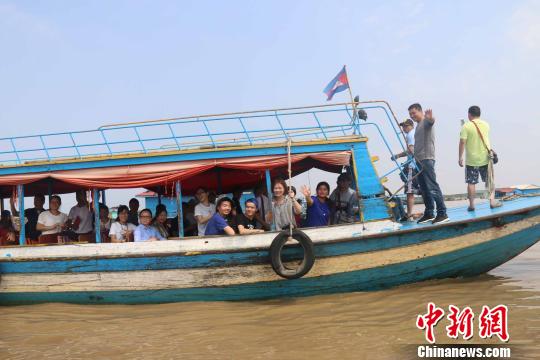 国际游客乘船参观洞里萨湖“水上人家”。 廖敏佳 摄