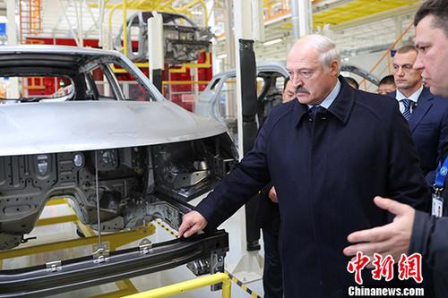 资料图:中国与白俄罗斯的首个汽车合作项目举行全散件组装新厂落成典礼暨首台量产车下线仪式。卢卡申科试乘新下线车辆。中新社记者 王修君 摄
