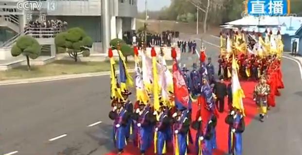 当地时间9时30分,也就是北京时间8时30分左右,金正恩一行抵达军事分界线,与在那里等待的文在寅首次会面,两人握手寒暄。接下来的欢迎仪式上,双方共同检阅了韩国传统仪仗队。