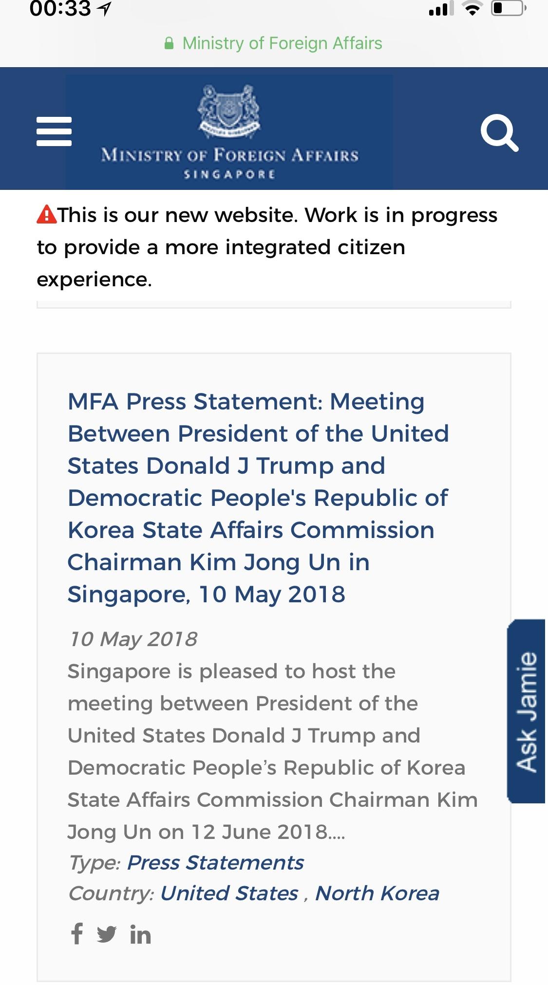在特朗普宣布6月12号将在新加坡举行美朝峰会后,新加坡外交部说,新加坡欢迎美国总统特朗普与朝鲜领导人金正恩于6月12日的会晤。