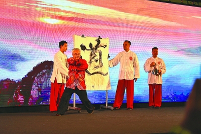 上海八卦掌协会会长王翰之表演书法。王怀成摄/光明图片
