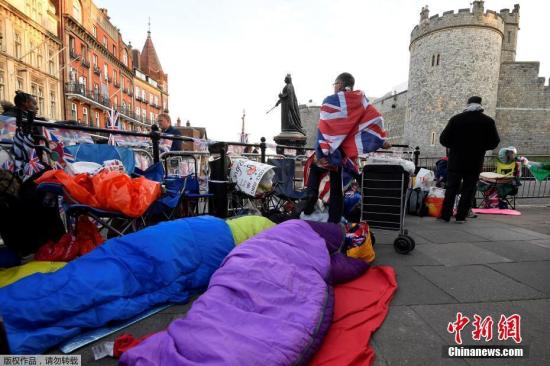 当地时间5月18日,英国皇室的“粉丝”在温莎城堡外搭“地铺”,只为一睹第二天哈里王子大婚的现场。