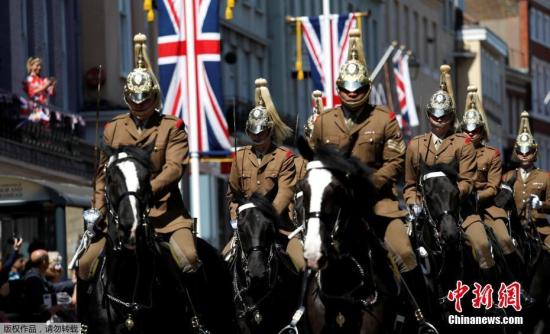 当地时间5月17日,英国士兵在温莎城堡外参加带妆彩排,为5月19日哈里王子婚礼做准备。