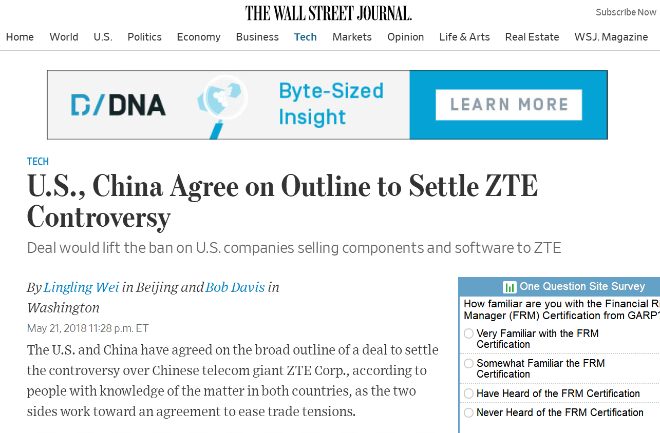 【环球网报道 记者 查希】美国《华尔街日报》5月22日援引消息人士的话报道称,中国和美国方面已经就解决中兴的争议问题达成大致框架方案,协议将解除美国公司向中兴销售零部件和软件的禁令。
