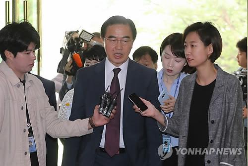 5月25日,在中央政府首尔办公楼,统一部长官赵明均(中)被记者团团围住。(图片来源:韩联社)