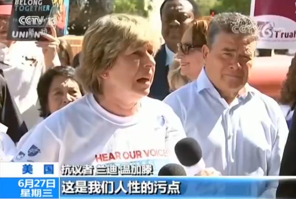 抗议者兰迪·温加滕:特朗普认为这只是政治问题,他置人命于不顾,让儿童遭受不可挽回的心理创伤,这是人性的污点,这是政策的污点,这已经超越了政治本身。