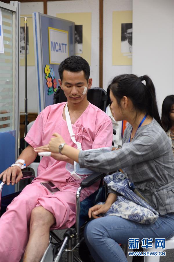 7月9日,在泰国普吉岛的哇集拉医院,一名华人志愿者(右)指导中国受伤游客活动手指关节。泰国普吉岛附近5日发生游船翻沉事故后,大批中泰两国志愿者纷纷加入,尽其所能提供帮助,成为救援大军中不可或缺的力量。新华社记者 秦晴 摄