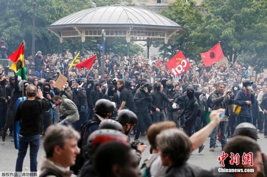 资料图:在巴黎,戴面罩的示威者们与防暴警察在街头对峙。