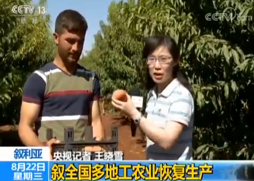 央视记者 王晓雪:我们现在是在哈马市的一片农庄,这里在战后也恢复了生产,现在正值桃园收获的季节,我们可以看到这里的桃子长势非常的喜人,在旁边的田庄里,还有一些其他的作物。