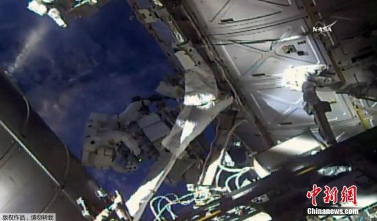 资料图:国际空间站上两名宇航员出舱太空行走,更换检查两个外置冷却箱。
