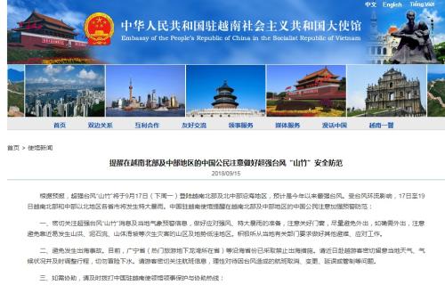 中新网9月15日电 据中国驻越南大使馆消息,根据预报,超强台风“山竹”将于9月17日(下周一)登陆越南北部及北中部沿海地区,预计是今年以来最强台风。受台风环流影响,17日至19日越南北部和中部以北地区各省市将发生特大暴雨。中国驻越南使馆提醒在越南北部及中部地区的中国公民注意加强预警防范: