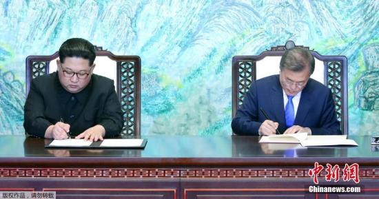 资料图:当地时间4月27日,韩朝首脑会晤在板门店举行,文在寅和金正恩跨越军事分界线实现历史性握手。双方领导人在经过一天会谈后,共同签署了《板门店宣言》,双方确认了通过完全弃核实现半岛无核化的共同目标,争取年内宣布结束战争状态,实现停和机制转换。图为签署仪式现场。