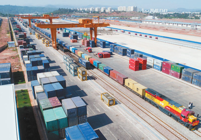 从云南昆明桃花村站驶向广西钦州港东站的中新互联互通南向通道班列,货物将在钦州港出境航运至新加坡。