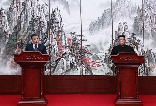 当地时间9月19日上午,韩国总统文在寅与朝鲜最高领导人发表首脑会谈结果。(图片来源:韩联社)