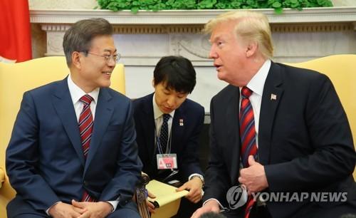 资料图片:韩国总统文在寅(左)和美国总统特朗普。(图片来源:韩联社)