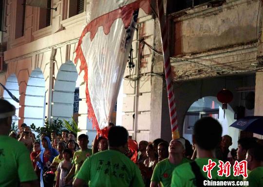 槟州华人表演以额头顶起十几米高大旗的绝技。 陈悦 摄