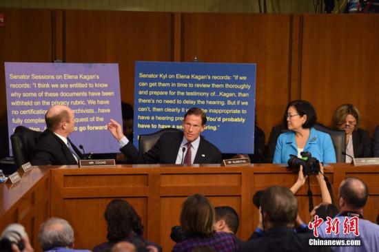 当地时间9月4日,美国参议院司法委员会就布雷特·卡瓦诺出任最高法院大法官举行提名听证会,民主党参议员要求推迟听证会。中新社记者 邓敏 摄